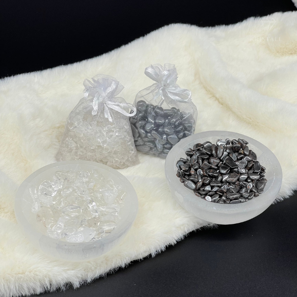 Lade deine Heilsteine und deinen Edelsteinschmuck auf. Entladen Hämatit/ aufladen Bergkristall. Die Bergkristall und Hämatit Chips kannst du in jeweils eine Schale legen, die möglichst aus natürlichem Material sein sollte, wie zb einer Selenit, Bergkristall oder Muschelschale. Auch eine Glasschale ist gut geeignet.