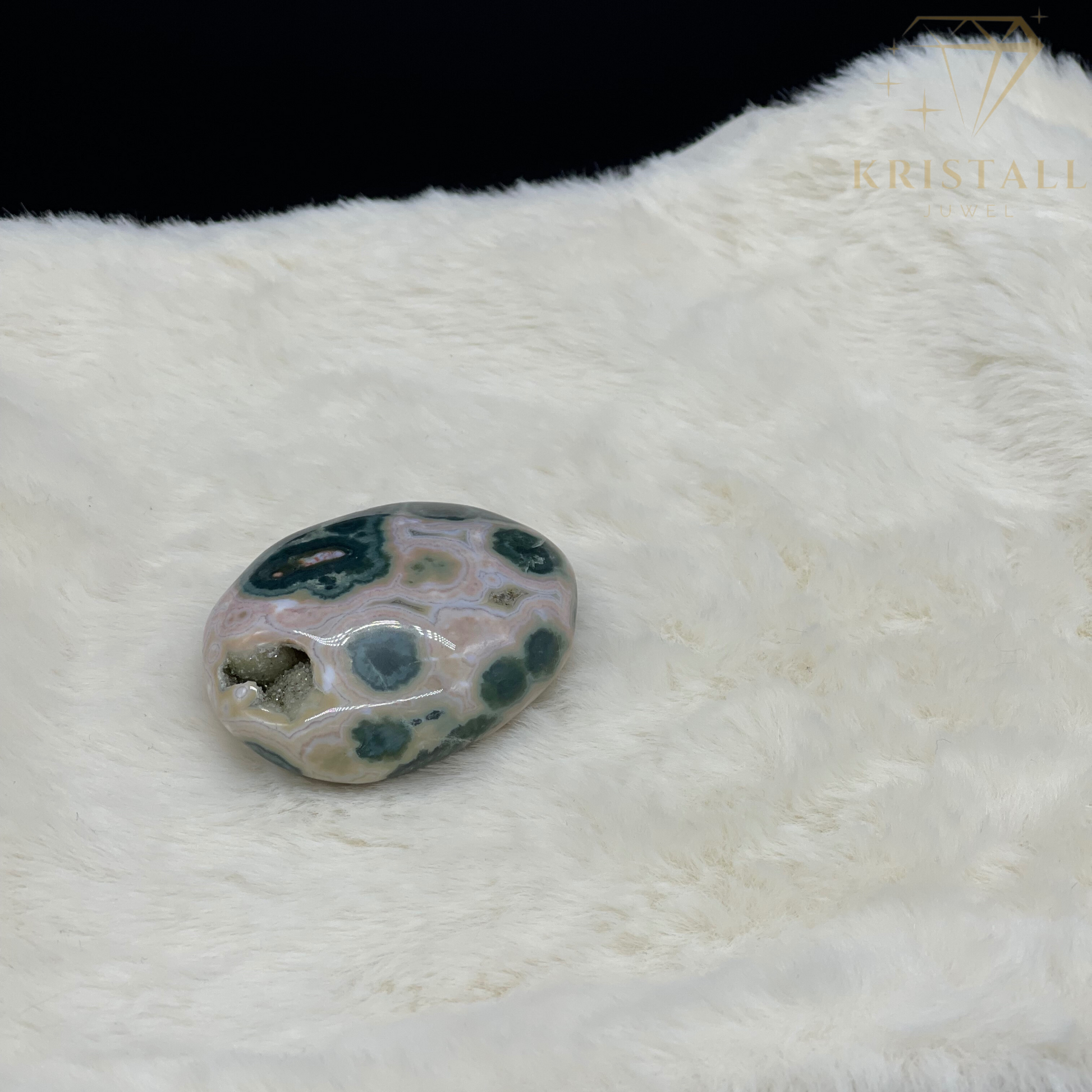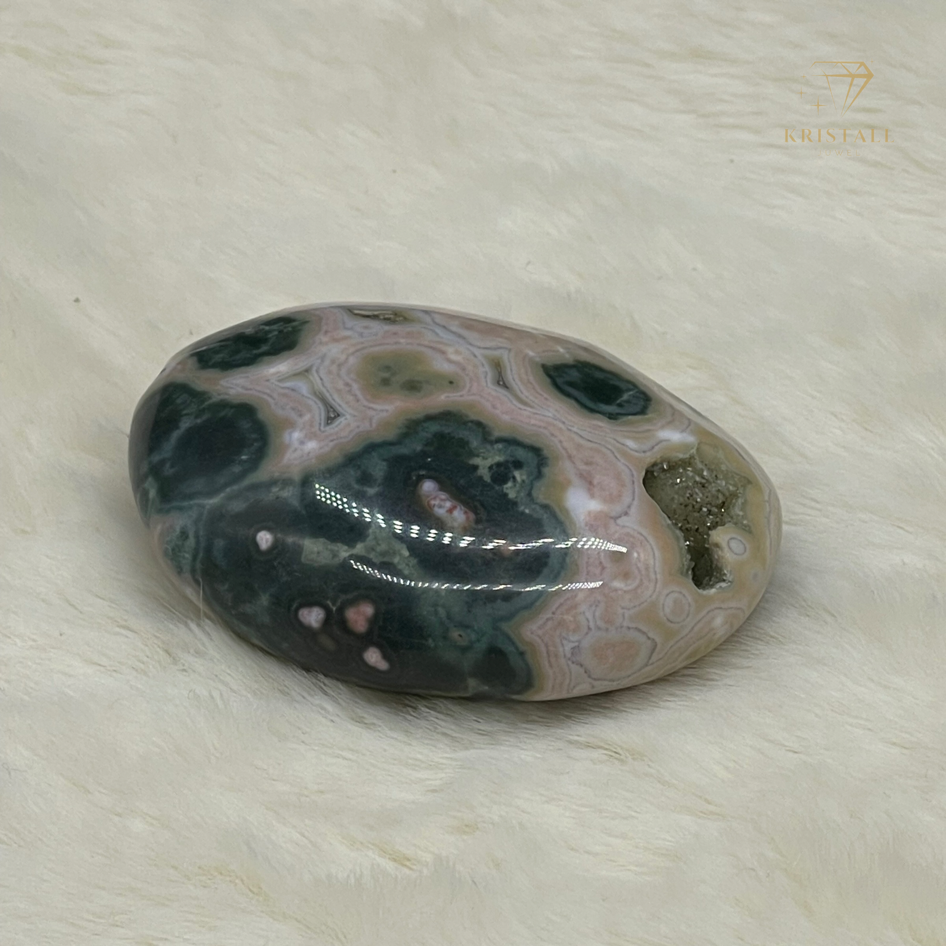 Der Ozean Jaspis steht für Erneuerung, er stimmt dabei positiv, macht uns belastbar und gelassen, hilft Konflikte zu lösen, und verhilft so zu einem erholsamen Schlaf, besonders geeignt für Menschen, die einen Neuanfang suchen und starten. Der Ozean Jaspis fördert die Verdauung, kräftigt das Immunsystem und lässt Lymphknoten abschwellen.