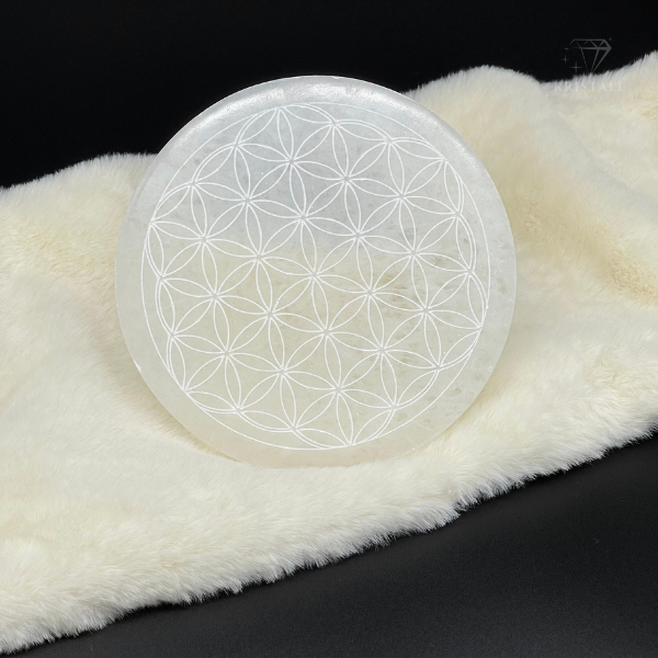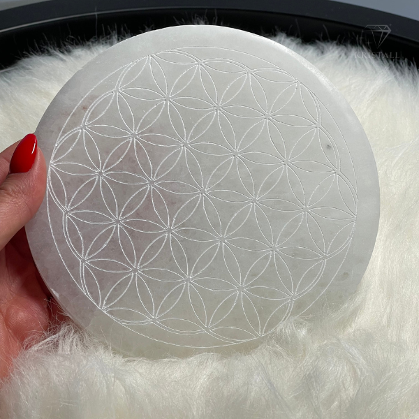 Die Selenit-Ladeplatte mit dem eingekerbten Muster ist wunderbar dazu geeignet, deine Trommelsteine oder deinen Schmuck energetisch zu reinigen und neu aufzuladen. Du kannst auch dein Wasserglas auf der Platte abstellen und das Wasser so energetisch aufladen. Selenit selbst muss nicht energetisch gereinigt werden und versorgt deine Steine mit klarer Energie.